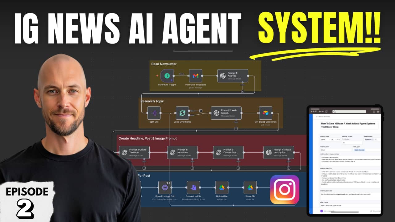 One newsletter becomes nine Instagram posts. That's what this system does every morning at 6am. It reads newsletters. Analyzes every article. Picks the best stories for your audience. Writes headlines. Generates images with text overlays. Drops everything into a dashboard. You approve what you like. Delete what you don't. Schedule what's left. Episode 2 of our AI Systems Series is live. The IG News Posts build. Watch it now.